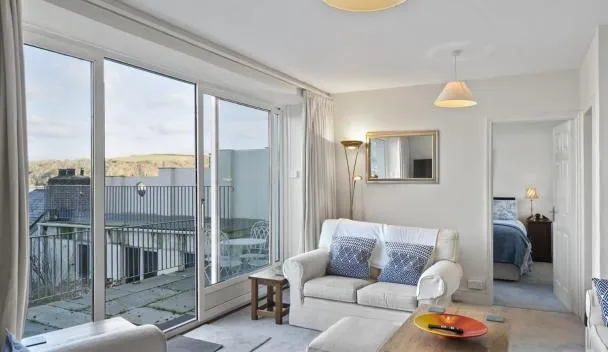 川の景色を望むFowey Penthouse, Foweyはバルコニーとコーヒーメーカー付きのユニットを提供しており、ニューキー駅まで約39kmです。リーディモニー・コーブビーチから徒歩19分の宿泊施設で、テラスと無料専用駐車場を提供しています。