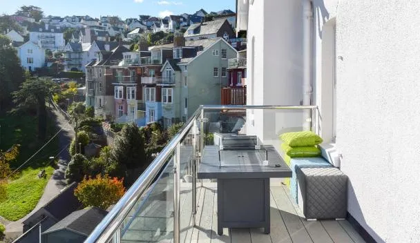 海の景色を望むBeach View - Stylish Stay, Estuary Views & Luxury Spa Accessはバルコニーとコーヒーメーカー付きのユニットを提供しており、ニュートン・アボット競馬場まで約45kmです。スモールズ・コーブビーチから1km以内の宿泊施設で、テラスと無料専用駐車場を提供しています。