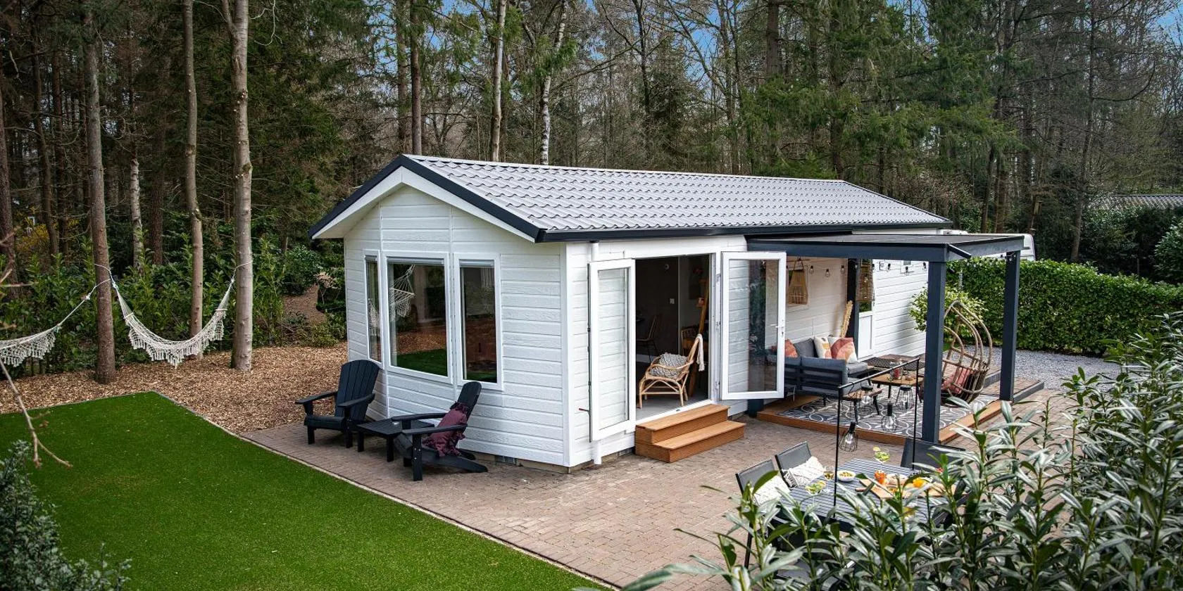エーペにあるKnus chalet in de bossen van Epe met fietsenは、庭の景色を望むユニット(無料WiFi利用可)、無料レンタル自転車、庭、テラスを提供しています。ヘットロー宮殿から21kmの宿泊施設で、レストランと無料専用駐車場を提供しています。