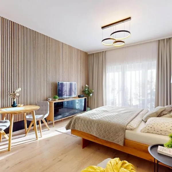 Vysoká nad KysucouにあるApartmany FABRIKからは山の景色が望めます。無料WiFiと無料専用駐車場を提供しており、Lietava Castleまで43kmです。 各ユニットには設備の整ったキッチン(冷蔵庫付)、ソファベッド付きシーティングエリア、薄型テレビ、洗濯機、専用バスルーム(シャワー、無料バスアメニティ付)が備わります。
