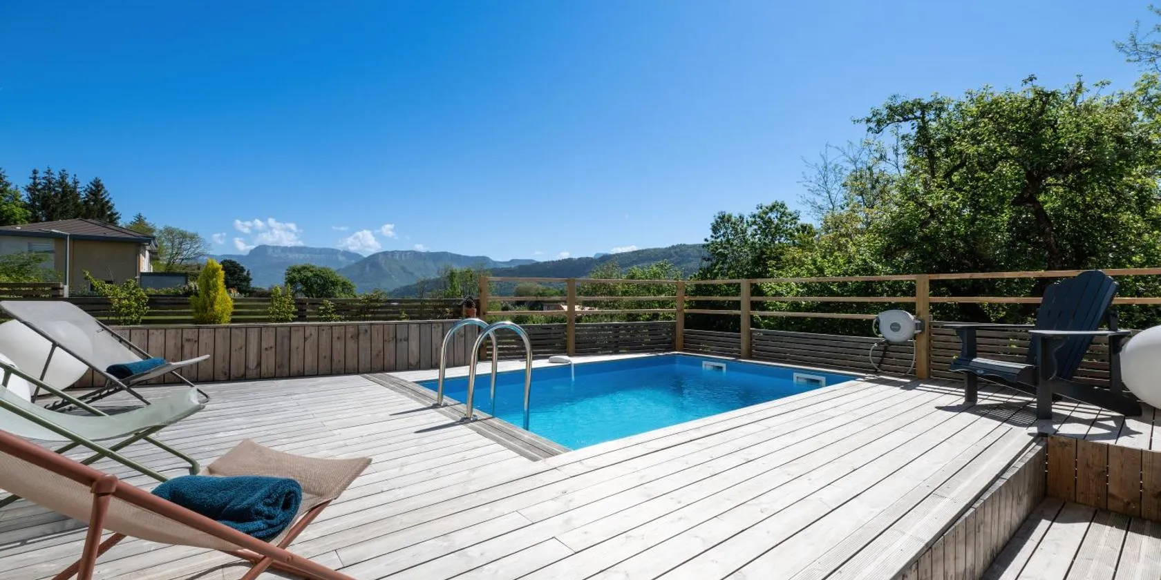 アヌシーにあるAppartement avec piscine & terrasse vue montagneはブールジェ湖から32km、ロシェクスポから38kmで、無料WiFi付きのユニット、エアコン、季節限定の屋外プールを提供しています。このアパートメントでは、専用プール、庭、無料専用駐車場を提供しています。...