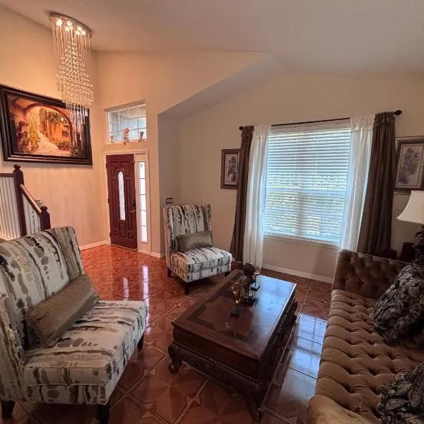 庭の景色を望むLuxury house in Disneyはキシミーの中心部にある宿泊施設で、屋外プール、フィットネスセンター、専用ビーチエリアを提供しています。この別荘では、無料専用駐車場、共用ラウンジ、無料WiFiを提供しています。 ベッドルーム4室、リビングルーム、設備の整ったキッチン(冷蔵庫、コーヒーメーカー付)、バスルーム(シャワー、ホットタブ付)3室が備わるエアコン付きの別荘です。