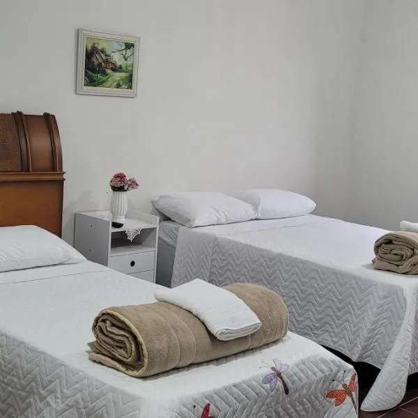 Soledade de MinasにあるRecanto Águas Clarasは、山の景色を望むユニット(無料WiFi利用可)、屋外プール、庭、テラスを提供しています。この宿泊施設では、バルコニーと無料専用駐車場を提供しています。 ベッドルーム2室、リビングルーム、設備の整ったキッチン(冷蔵庫、ポット付)、バスルーム(シャワー付)1室が備わる別荘です。