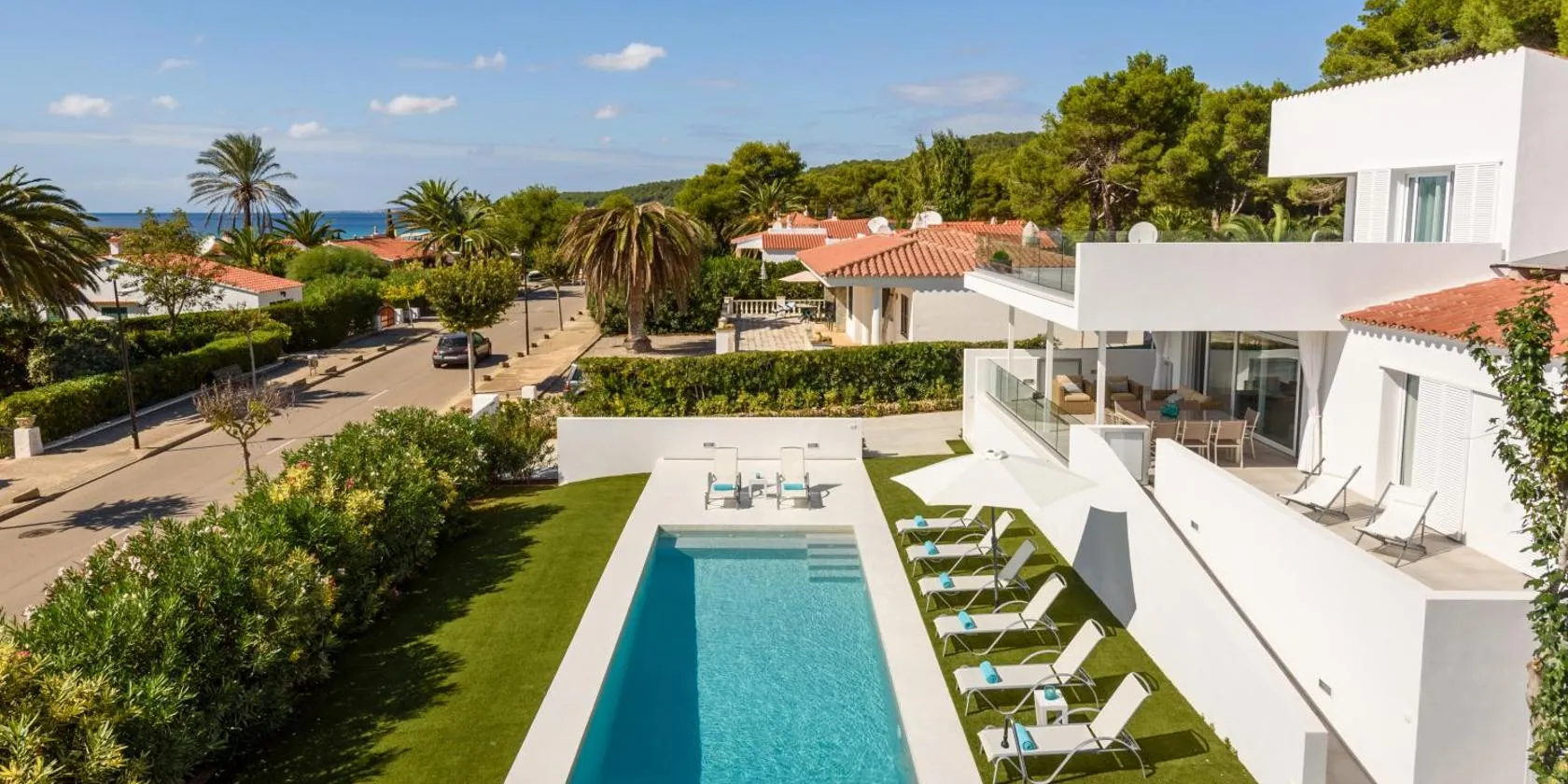 プールの景色を望むVilla Llebeig 155TS Son Bou By MENORCARENTALSは季節限定の屋外プール、レストラン、バーを提供する宿泊施設で、ソン・ボウ・ビーチまで約2.9kmです。この別荘では、専用プール、庭、バーベキュー施設、無料WiFi、無料専用駐車場を提供しています。