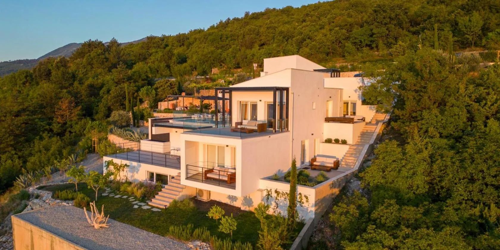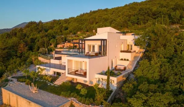 オパティヤにあるSensational Istria Villa Villa Scenice Platinium 5 Bedrooms Stunning Sea Views Sauna And Gymはスヴェティ・イヴァンビーチからわずか徒歩13分で、バルコニー付きのユニット、庭、屋外プールを提供しています。このヴィラは専用プールと無料WiFiも提供しています。