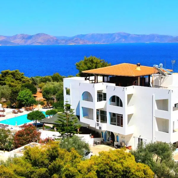 Nhìn ra núi, Hestia cung cấp chỗ nghỉ có hồ bơi ngoài trời theo mùa, trung tâm thể dục và khu vườn, cách Bãi biển Agkona Beach khoảng 2.9 km.