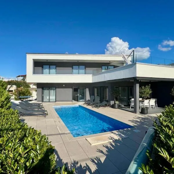 Modern villa with private pool near the sea se nachází v destinaci Baška a může se pochlubit terasou s výhledem na hory a na bazén. Těšit se můžete také na sezónní venkovní bazén, saunu a vířivku.