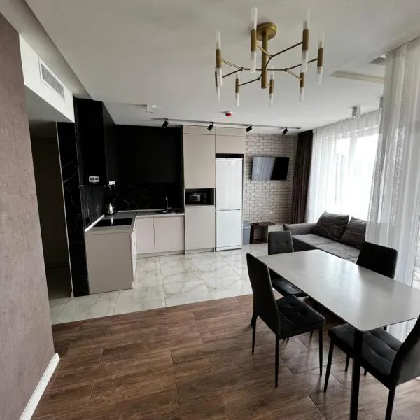 GolubinoyeにあるАпартаменти SunVI в ЖК Сонячний Кварталは、エアコン完備のユニット(無料WiFi利用可)と庭(テラス付)を提供しています。敷地内の専用駐車場を提供しています。 設備の整った各ユニットには洗濯機、薄型テレビ、ソファ、ワードローブが備わります。キッチンには冷蔵庫、電子レンジ、コンロ、ポットも備わります。